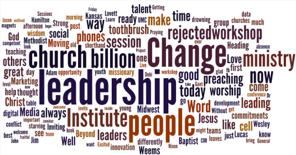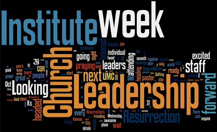 I am part of a team from First United Methodist Church in El Dorado, KS attending Leadership Institute 2012. I collected Twitter updates tagged with #li2012. Then I used Wordle to create word clouds with the text of updates during the conference. I edited out Twitter usernames, RT and #li2012 to get a better view of the conversation. I hope that you enjoy the results!