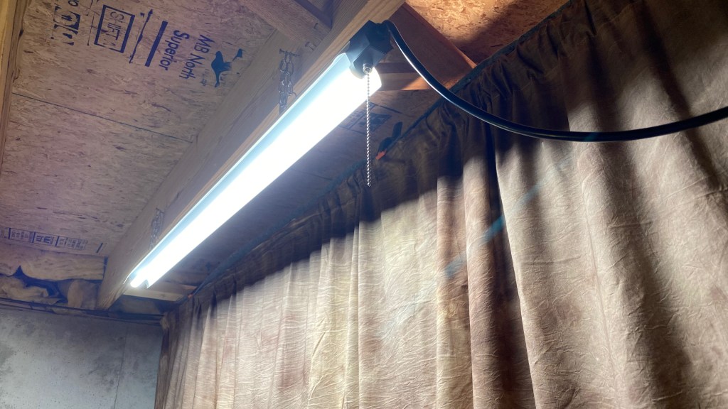 It works well in the limited space at the desktop. A 4 Foot LED Shop Light hangs from the ceiling and supplements the light. It’s a rough attempt at three-point lighting.