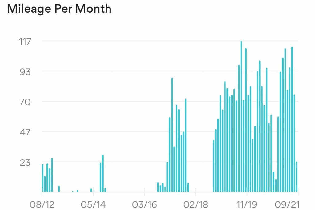 With a 4.5 mile run today, I recorded 1,0002 activities with the RunKeeper app. I have had on and off seasons of running over the years. Here's a snapshot of my mileage each month.