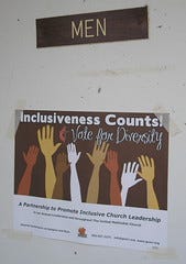 A sign promoting inclusiveness in delegates to General Conference can be found many places here at Western North Carolina Conference - including this location on the outside of a bathroom door. I found the contrast of these two signs to be interesting. Context matters for promotional materials.