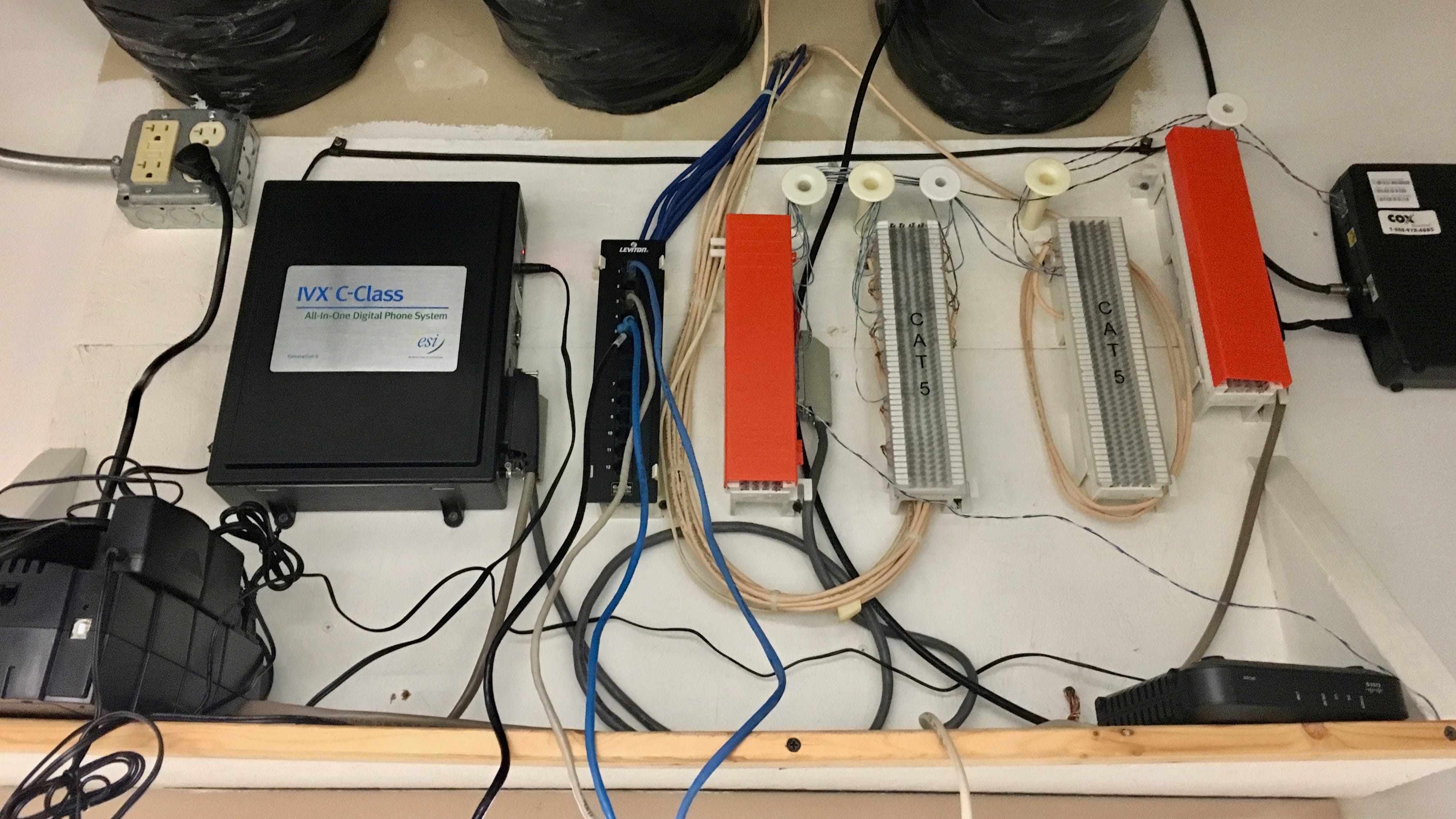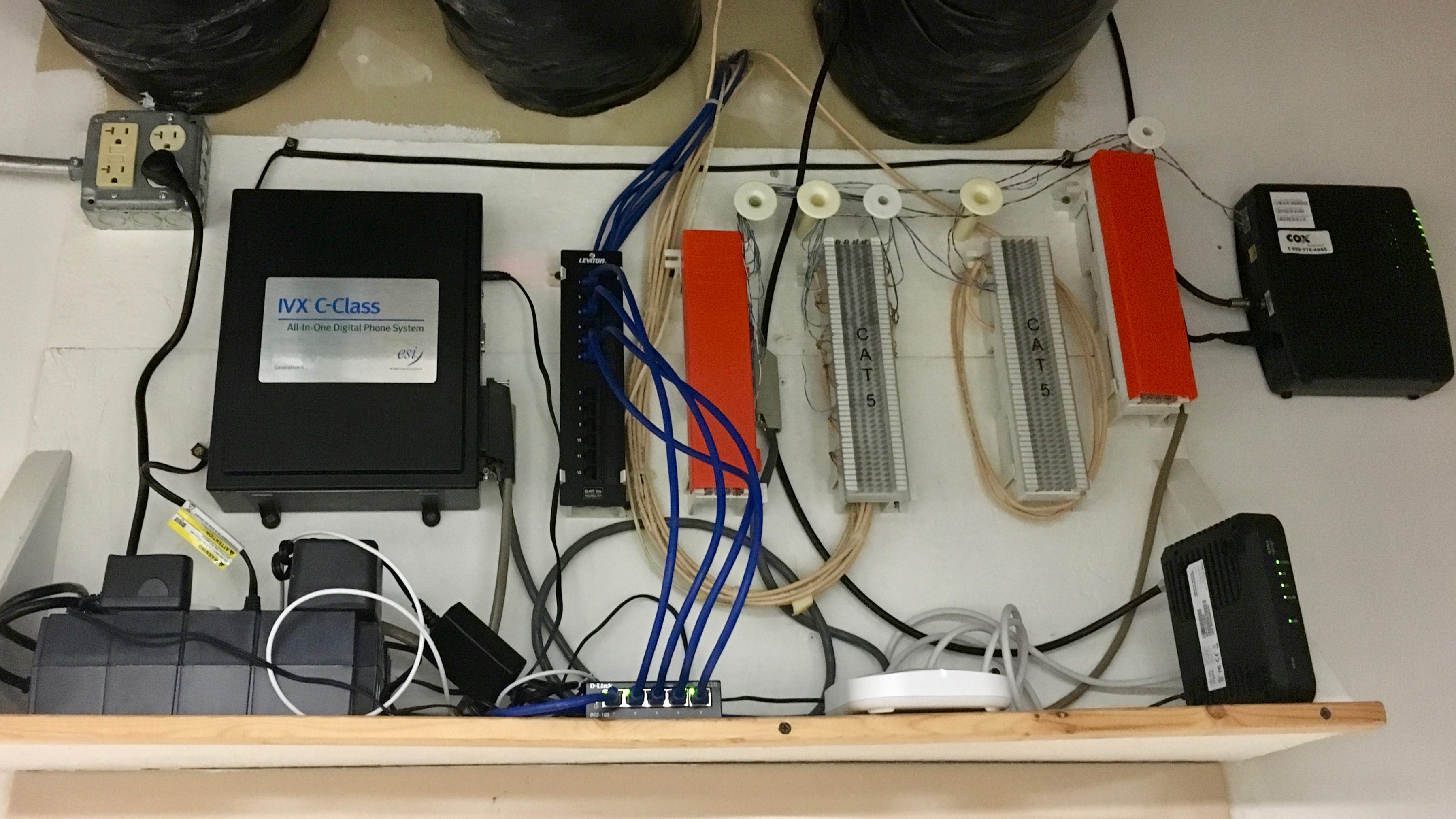 The next step was to get them installed and going. The main network equipment is on a shelf above the door of a closet. Here is the before picture: