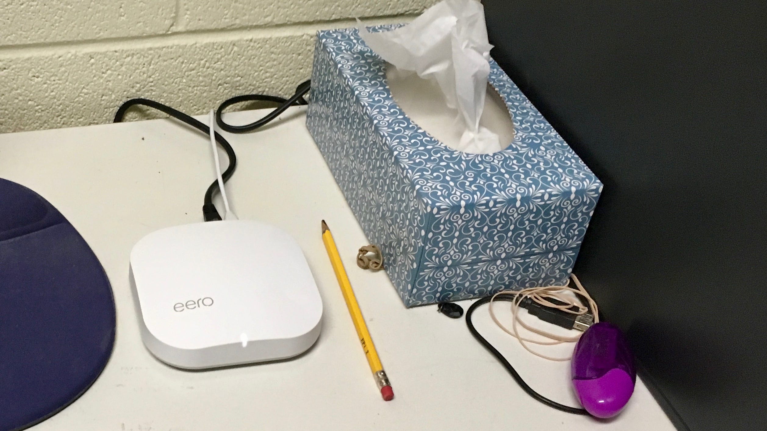 There is the Eero on the right hand side, connected to the cable modem on the right and a network switch to the left. A handful of 2 foot patch cables came in handy to help cut down on the cable clutter.