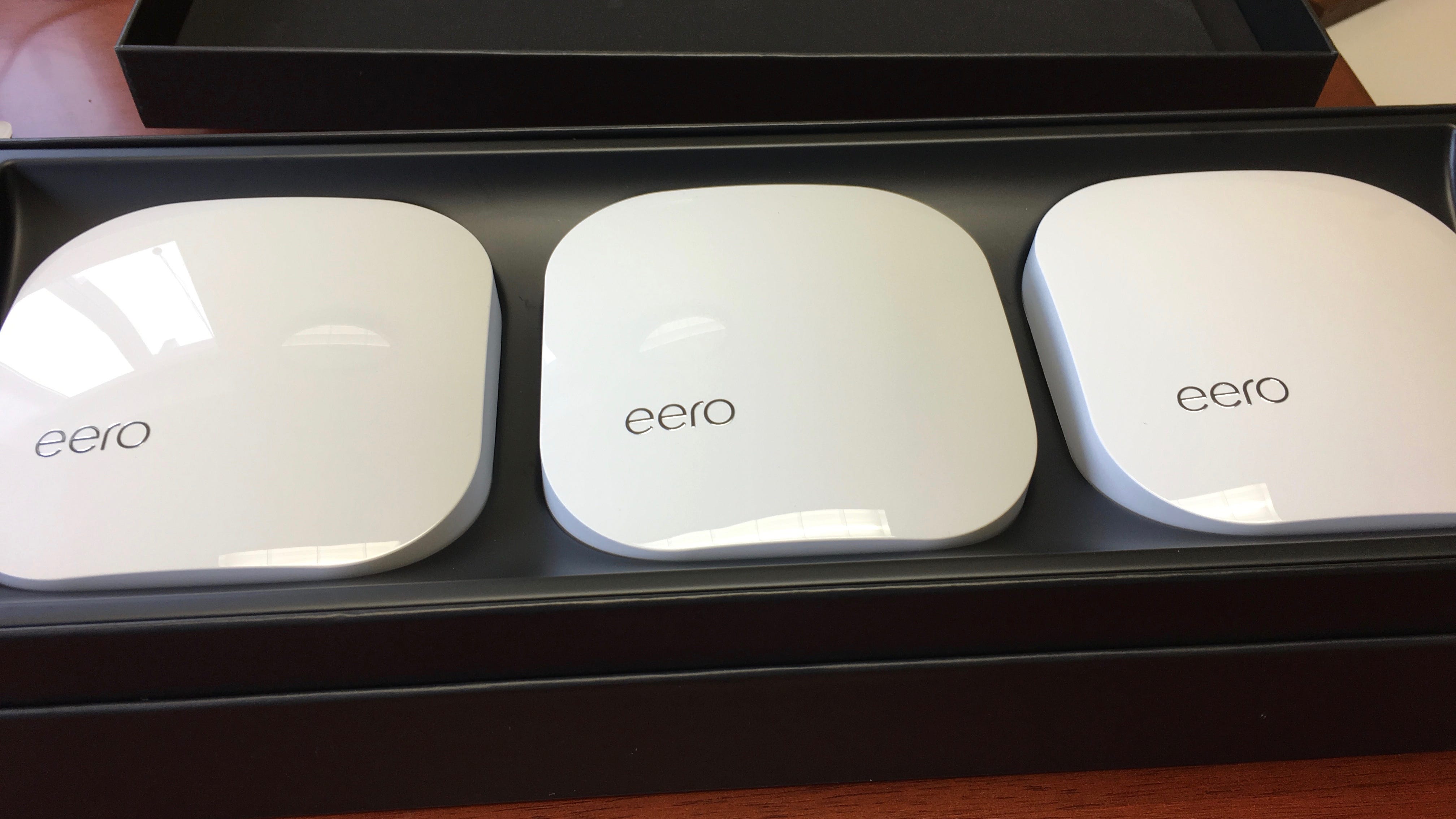 A solution from Ruckus Wireless, while it would have been excellent, was beyond my ability to install. So, I was started looking for other solutions and found a great one in the Eero Pro WiFi System. You can purchase it from Amazon.com here and find more information about Eero and their technology here. After a Memorials request was approved, I placed the order. It wasn't too long until these sweet looking pieces of technology arrived: