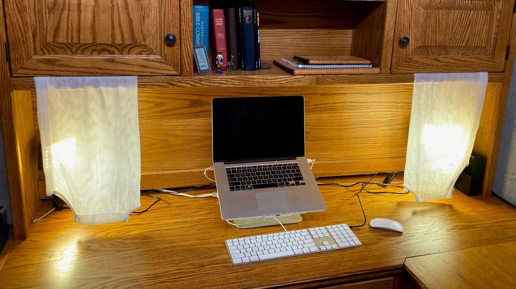 As you could see from the picture above, our basement is pretty dark. Some months ago, I had purchased a set of 60 LED Portable Light Lamps for Table Top Photo Studio. I set these on the desk for use during video conference calls.