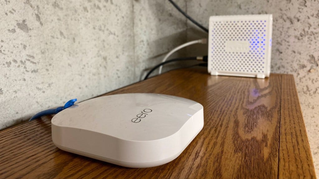 I added a few pieces of decor to help fill the frame in a video conference call. You can still tell that it is a concrete wall, yet it softens the space a bit. Online video production is all supported with high-speed internet delivered through our eero Pro mesh WiFi system. It provides solid delivery of data from our cable internet connection to devices throughout our house.