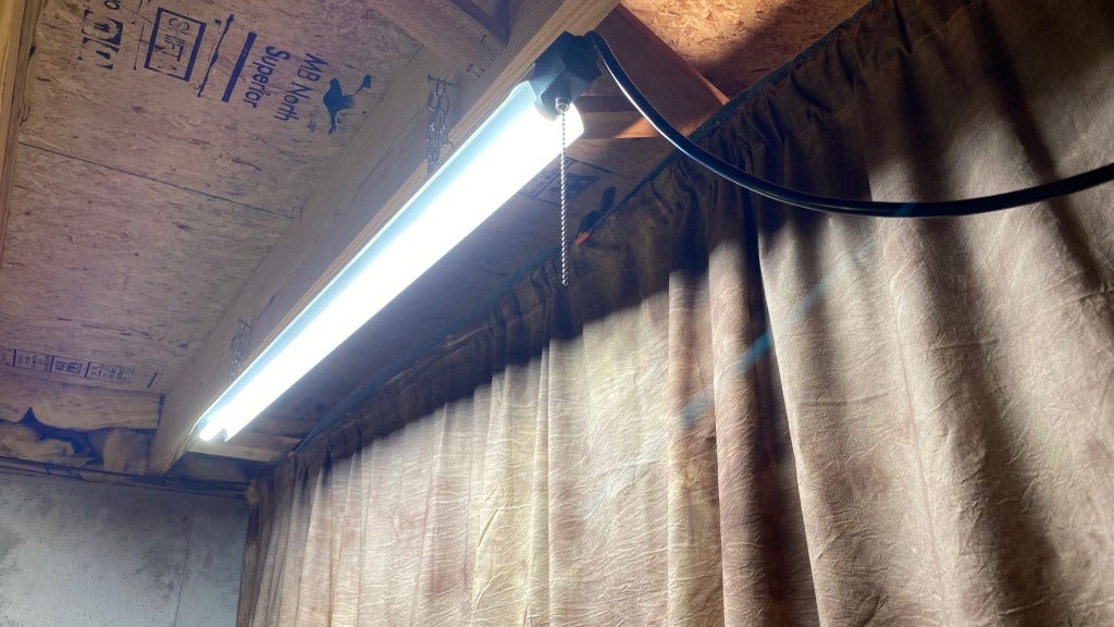 It works well in the limited space at the desktop. A 4 Foot LED Shop Light hangs from the ceiling and supplements the light. It's a rough attempt at three-point lighting.